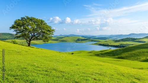 © Slamet, Obraz premium Serene Lake and Rolling Hills Landscape