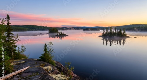 © Dilan, Fototapeta premium Serene lake at dawn with mist, reflections and beautiful light creating a peaceful scene