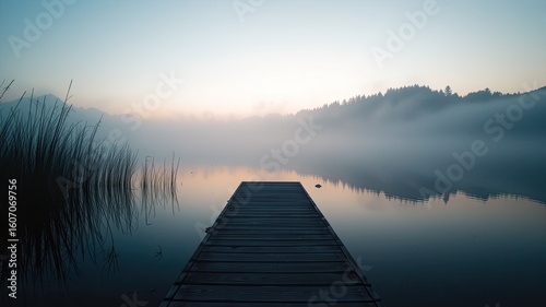 © Chaowarat, Fototapeta premium Serene Lake at Dawn with Wooden Pier