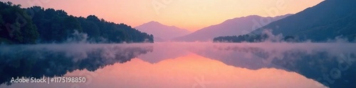 © Sutasinee, Obraz premium Serene lake at dusk with mist rising from water surface, nature, scenery, serene