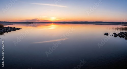 © laafa , Naklejka premium Serene Lake at Sunrise Reflective Water and Tranquil Atmosphere
