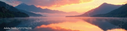 © Kingphet, Fototapeta premium Serene lake at sunrise with misty mountains in the background, peaceful, reflection