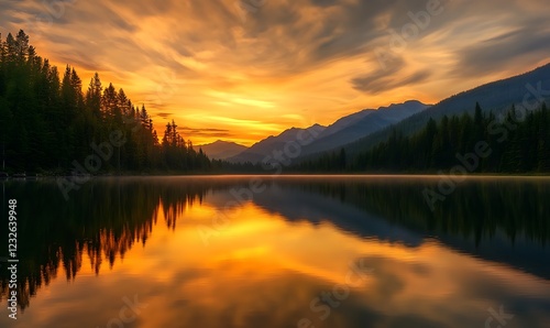 © AhmadTriwahyuutomo, Obraz premium Serene lake at sunset, reflecting vibrant colors against a mountainous backdrop.