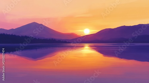 Fototapeta premium Serene Lake at Sunset with Mountain Silhouette and Vibrant Reflections, Illustration.