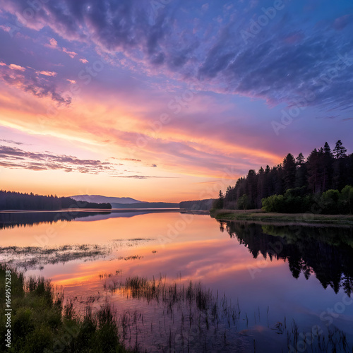 © TanminAkter, Fototapeta premium Serene lake at sunset with vibrant sky and forest reflection full hd 4k stock image download clouds water