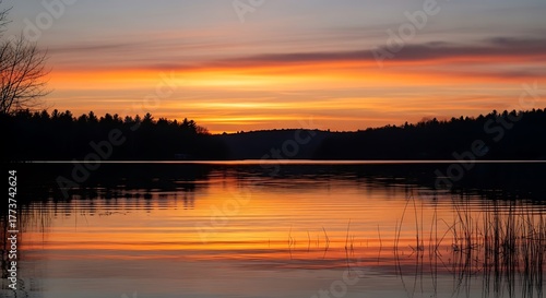 © Sidolen, Fototapeta premium Serene lake at twilight with sky in radiant orange and crimson glow