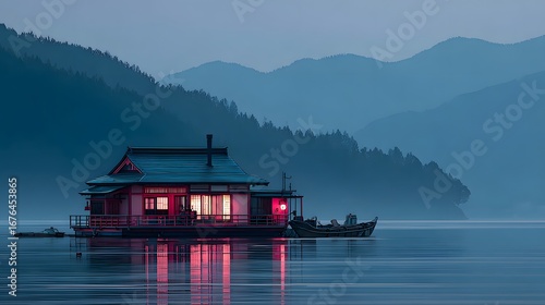 © Jojo*, Fototapeta premium Serene lake house at dawn, illuminated by soft pink light, nestled amongst misty mountains.