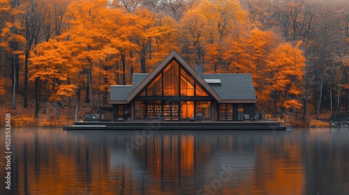 © tunanon, Fototapeta premium Serene Lake House Surrounded by Autumn Colors