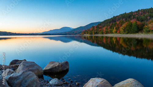 Obraz premium Serene lake, its colors reflecting off the tranquil waters, illuminating the scattered stones