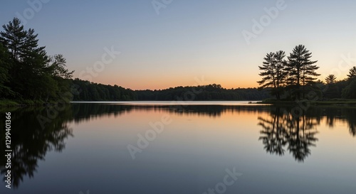 Fototapeta premium Serene lake landscape reflecting twilight hues with silhouettes of trees in...