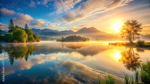Fototapeta premium Serene lake landscape with a stunning panoramic view of a sunrise over calm waters and misty mountains