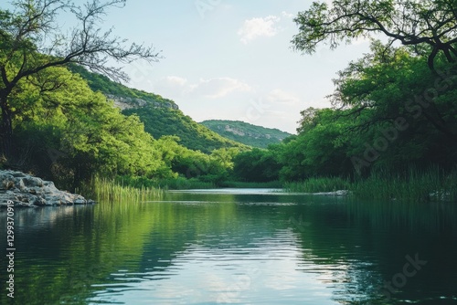 Naklejka premium Serene Lake Landscape with Lush Greenery and Reflective Water in a Tranquil Environment