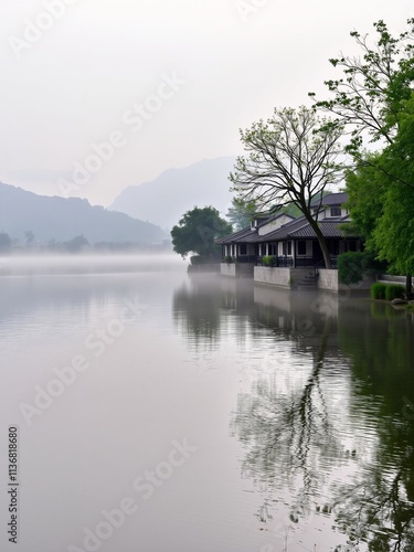 © Derek Brumby, Obraz premium Serene Lake Landscape with Mist and Reflection of Traditional Architecture