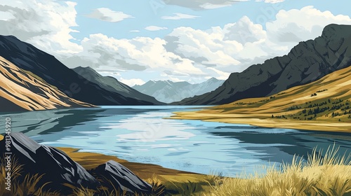 © GIFTE, Obraz premium Serene Lake Landscape with Mountains and Clouds