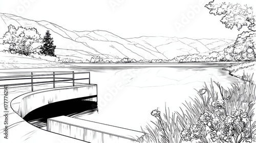 © Thinnawat, Fototapeta premium Serene Lake Landscape with Mountains and Vegetation in Black and White