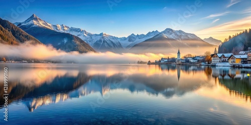 Fototapeta premium Serene lake Millstatt at dawn with misty atmosphere and snow-capped mountains in the background, Austria, lake, Austria
