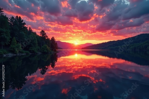 © Pasika, Fototapeta premium Serene lake mirrors fiery sunset, vibrant cloudscape above lush banks , vibrant, view