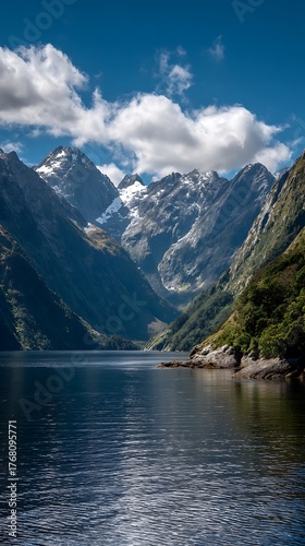 Fototapeta premium Serene Lake Mirrors Snowy Peaks Under Cloudy Blue Skies, New Zealand