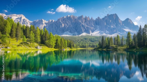 Fototapeta premium Serene lake nestled among mountains, its calm waters mirroring the...