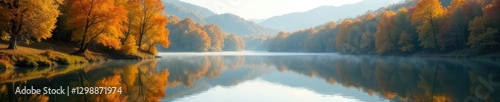 © Sutasinee, Fototapeta premium Serene lake on autumn morning with golden leaves reflected in its calm waters, golden leaves, foliage, reflections