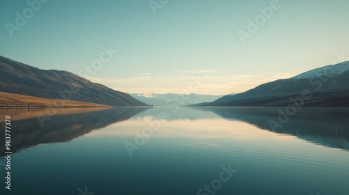 Obraz premium Serene lake reflecting mountains under a clear sky, evoking tranquility and...