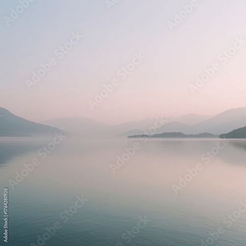© Islam, Fototapeta premium Serene lake reflecting soft pastel sky and distant misty mountains at dawn