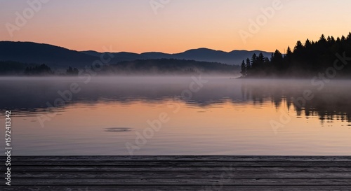 © warsilan, Fototapeta premium Serene lake reflecting the colorful sky at dusk with mountains in the distance