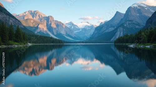 Fototapeta premium Serene lake reflecting the surrounding mountains and trees