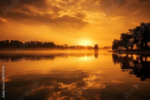© nsit0108, Obraz premium Serene lake reflecting the vibrant orange sky during a misty morning