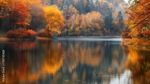 Fototapeta premium Serene lake reflecting vibrant autumnal forest