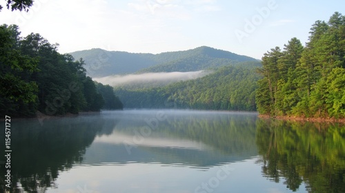 Fototapeta premium Serene Lake Reflection Surrounded by Lush Green Forest and Mountains