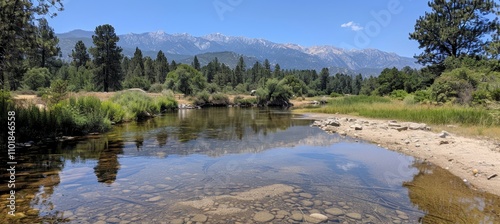 Obraz premium Serene lake reflections a tranquil scene of pine forests and majestic mountains