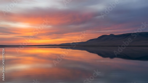 Fototapeta premium Serene Lake Reflects Fiery Sunset Sky and Distant Mountain Silhouette clouds orange