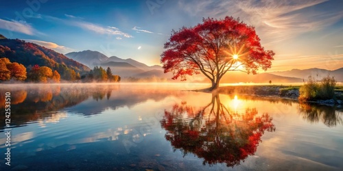 © Caitlin, Fototapeta premium Serene Lake Scene at Sunrise with Vibrant Red Tree and Reflections in Calm Waters - Nature Photography, Landscape, Tranquility, Sunrise, Scenic Beauty, Peaceful Atmosphere