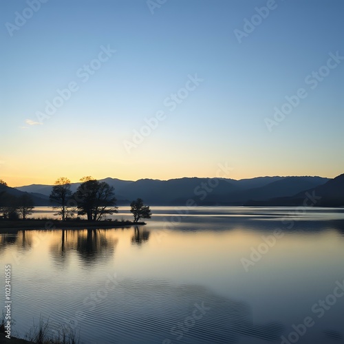 Naklejka premium Serene Lake Sunset Reflections: Mountains and Trees in Distance