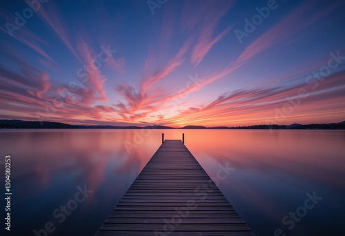 © Mehdi, Naklejka premium Serene Lake Sunset, Wooden Dock. Dramatic Sky Reflection. Pink Orange Purple Clouds. Wide Angle Peaceful Evening. Nature's Tranquility And Beauty. Stunning Landscape Scenery. Dreamy.