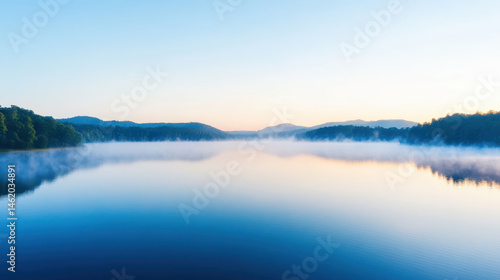© siraphol, Fototapeta premium Serene lake surface reflects early morning mist and soft light, creating tranquil atmosphere