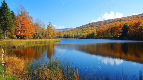 © BozStock, Fototapeta premium Serene lake surrounded by colorful autumn foliage with a clear blue sky.