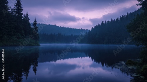 © indyntk, Fototapeta premium Serene lake surrounded by dense forest, reflections distorted by gentle rain, twilight sky turning deep purple, creating a moody and tranquil landscape