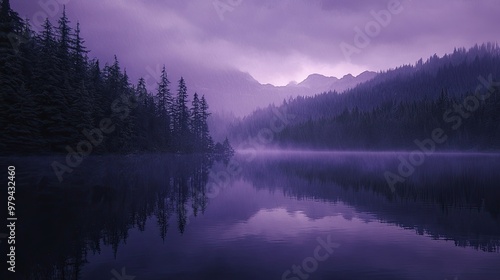 © indyntk, Fototapeta premium Serene lake surrounded by dense forest, reflections distorted by gentle rain, twilight sky turning deep purple, creating a moody and tranquil landscape