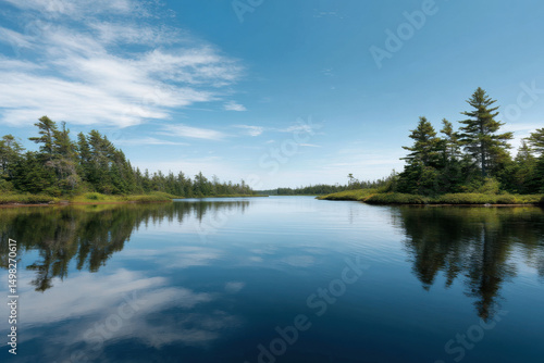 © Nevena, Naklejka premium serene lake surrounded by lush green forests in nova scotia reflecting clear blue sky