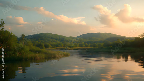 © Dezayn, Obraz premium Serene lake surrounded by lush green mountains and trees at sunset
