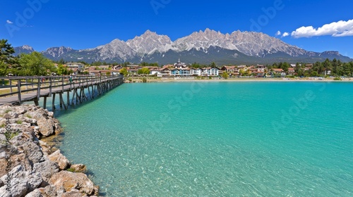 © peacehunter, Fototapeta premium Serene Lake Surrounded by Majestic Fir Trees Under Clear Blue Sky with Rugged Mountains