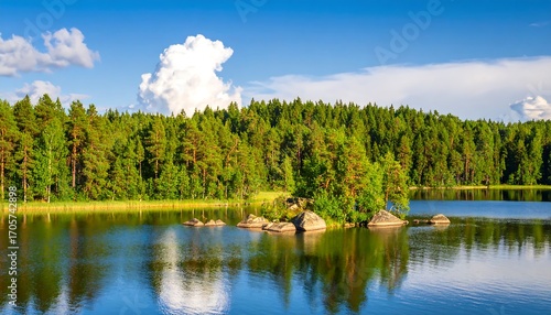 © watashi, Fototapeta premium Serene lake surrounded by pine forest