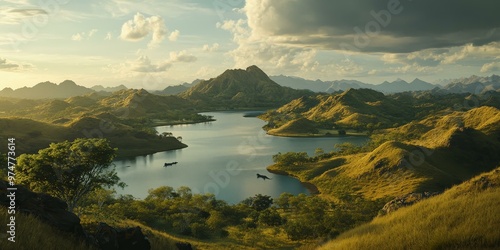 © jambulart, Obraz premium Serene lake surrounded by verdant hills.