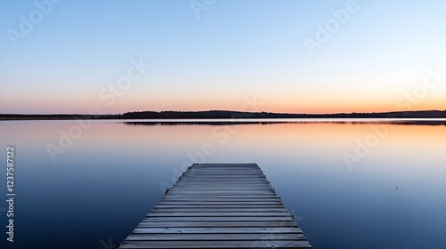 Fototapeta premium Serene lake view at sunset with a wooden pier extending into calm waters :...