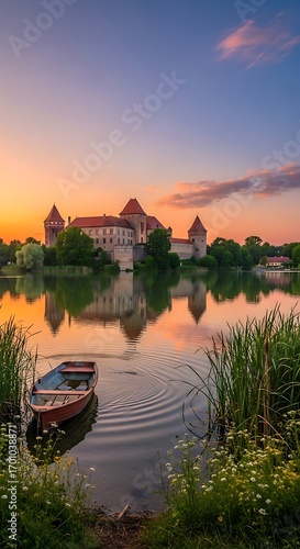 © Endruw, Fototapeta premium Serene lake view featuring a majestic castle reflecting in the tranquil waters at sunset