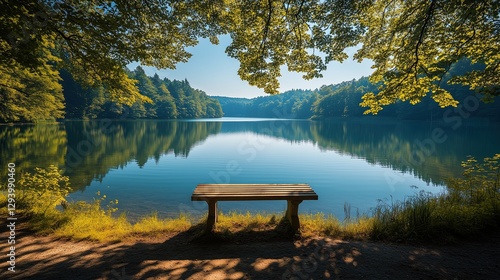 © จิรายุทธ แถบเงิน, Obraz premium Serene lake view with a bench under trees.