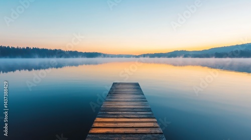 © AucArtStudio, Fototapeta premium Serene lake view with a wooden dock at sunset.