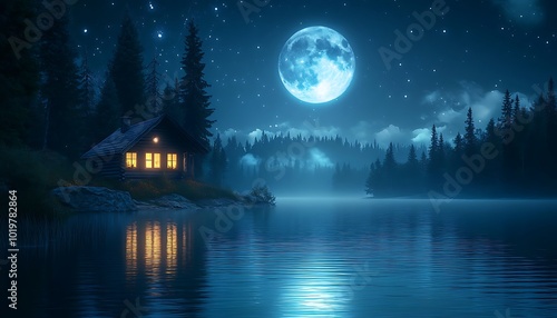 Fototapeta premium Serene Lake View with Cozy House and Full Moon